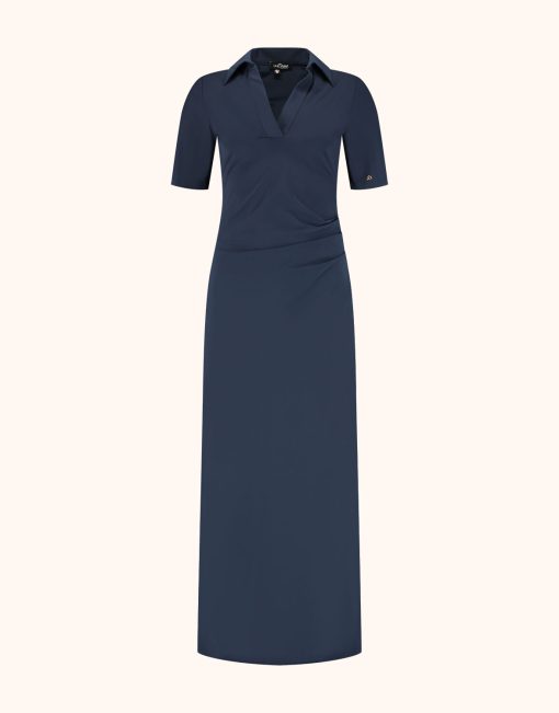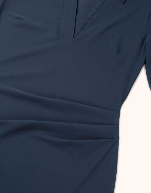 Meet Arlette: a stunning slim-fit dress crafted from our iconic Italian travel fabric. All our travel jersey styles are made from recycled yarn in an eco-friendly production cycle, read more here! Arlette features an open polo collar that adds a sporty edge think "borrowed from the boys, but better." A high slit brings a hint of flirtation, while flattering pleats at the hip create a cinched, curve-hugging silhouette. The result? A dress that makes maximum impact with minimal effort..