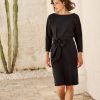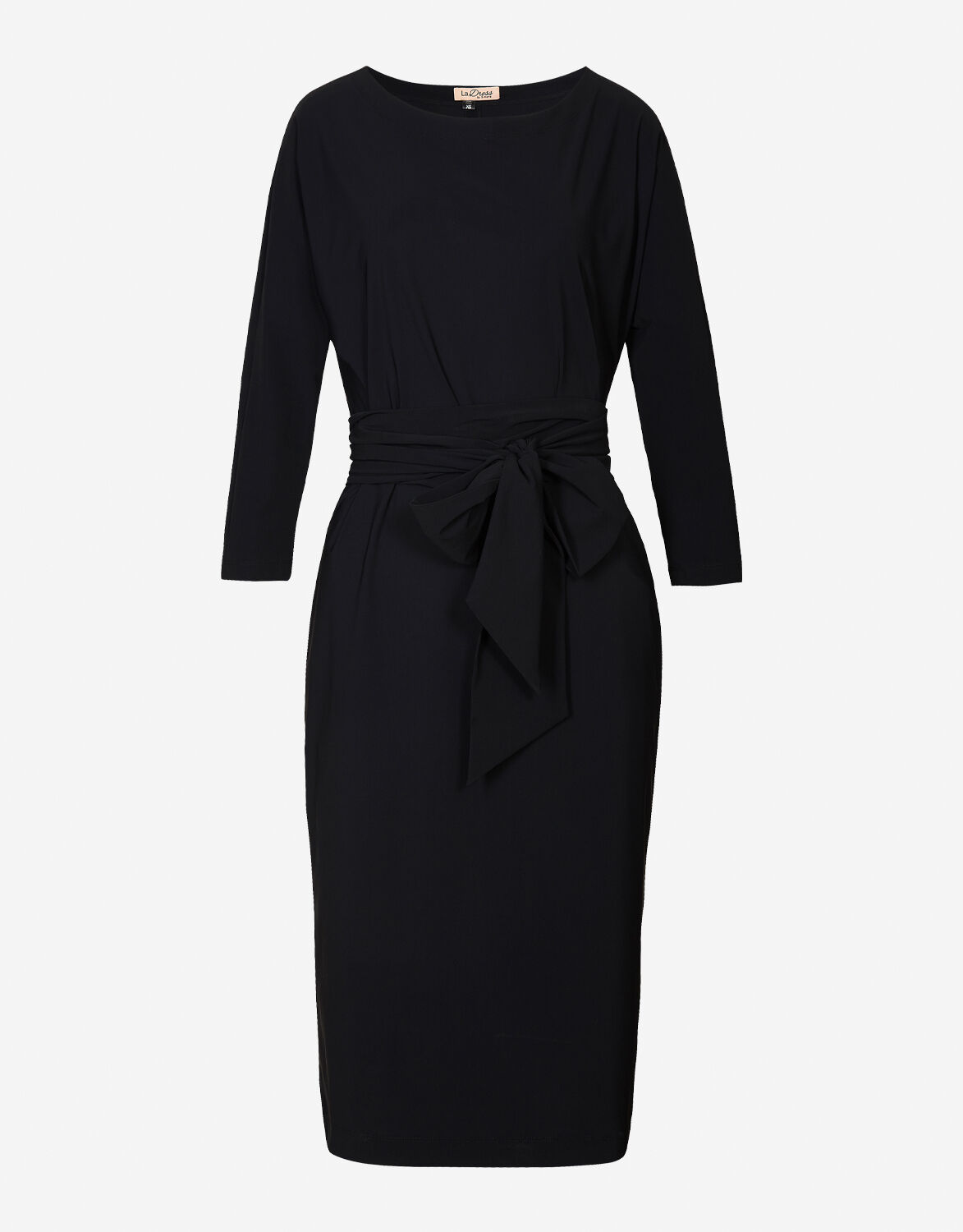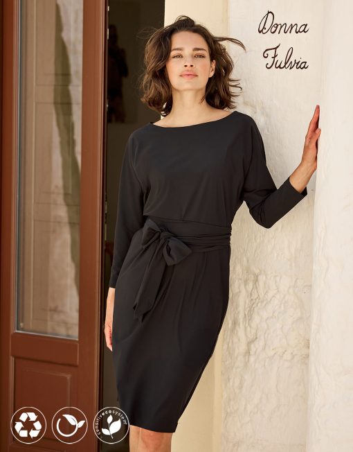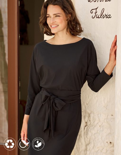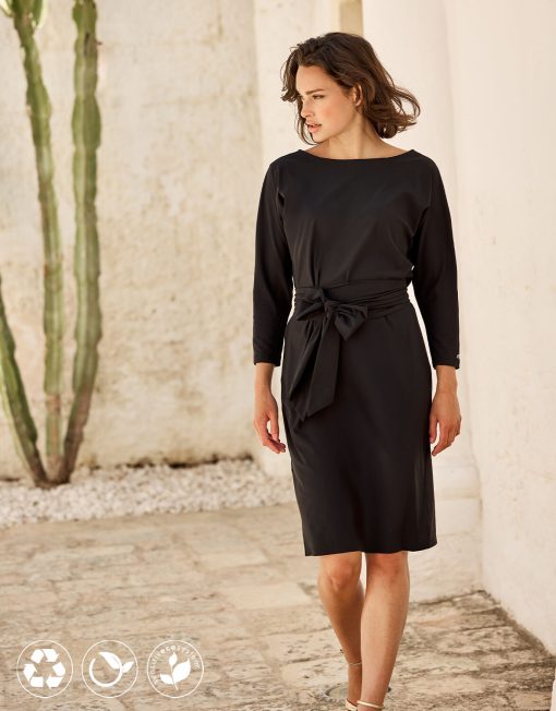 Our bestselling butterfly dress Caroline comes with a sash to create a beautifully feminine silhouette. She has a boat neck, 3/4 sleeves and falls just above the knee. Caroline is made from our iconic Italian travel jersey fabric. All our travel jersey styles are made from recycled yarn in an eco-friendly production cycle, read more here!