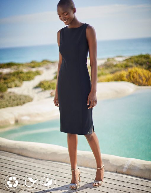 This beautiful sleeveless pencil dress is a real classic style, that falls just over the knee. Gloria is made from our iconic Italian travel jersey fabric. All our travel jersey styles are made from recycled yarn in an eco-friendly production cycle, read more here! The best part? You can easily take her from desk to dinner in an instant. Combine her with one of our blazers on a chilly summer night.
