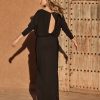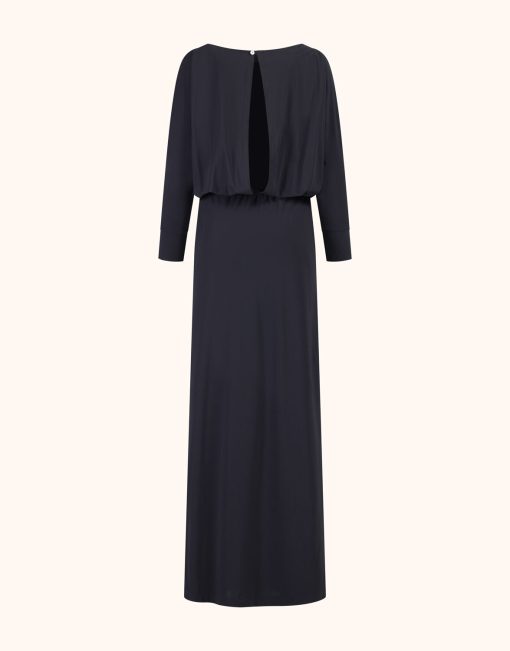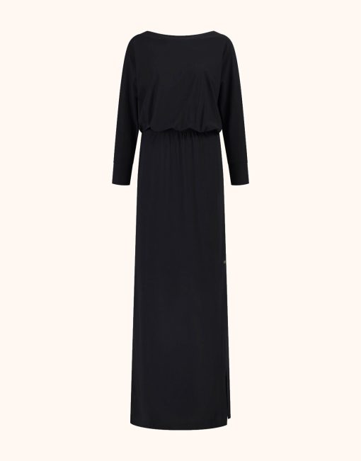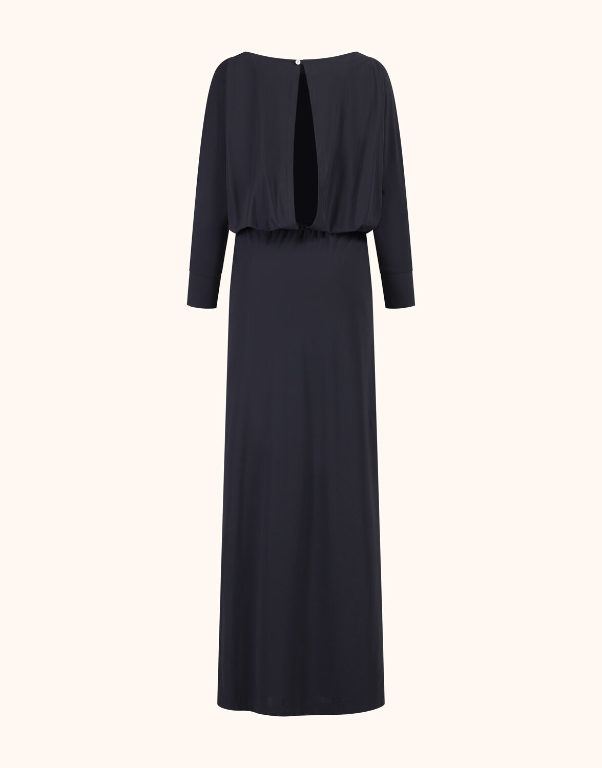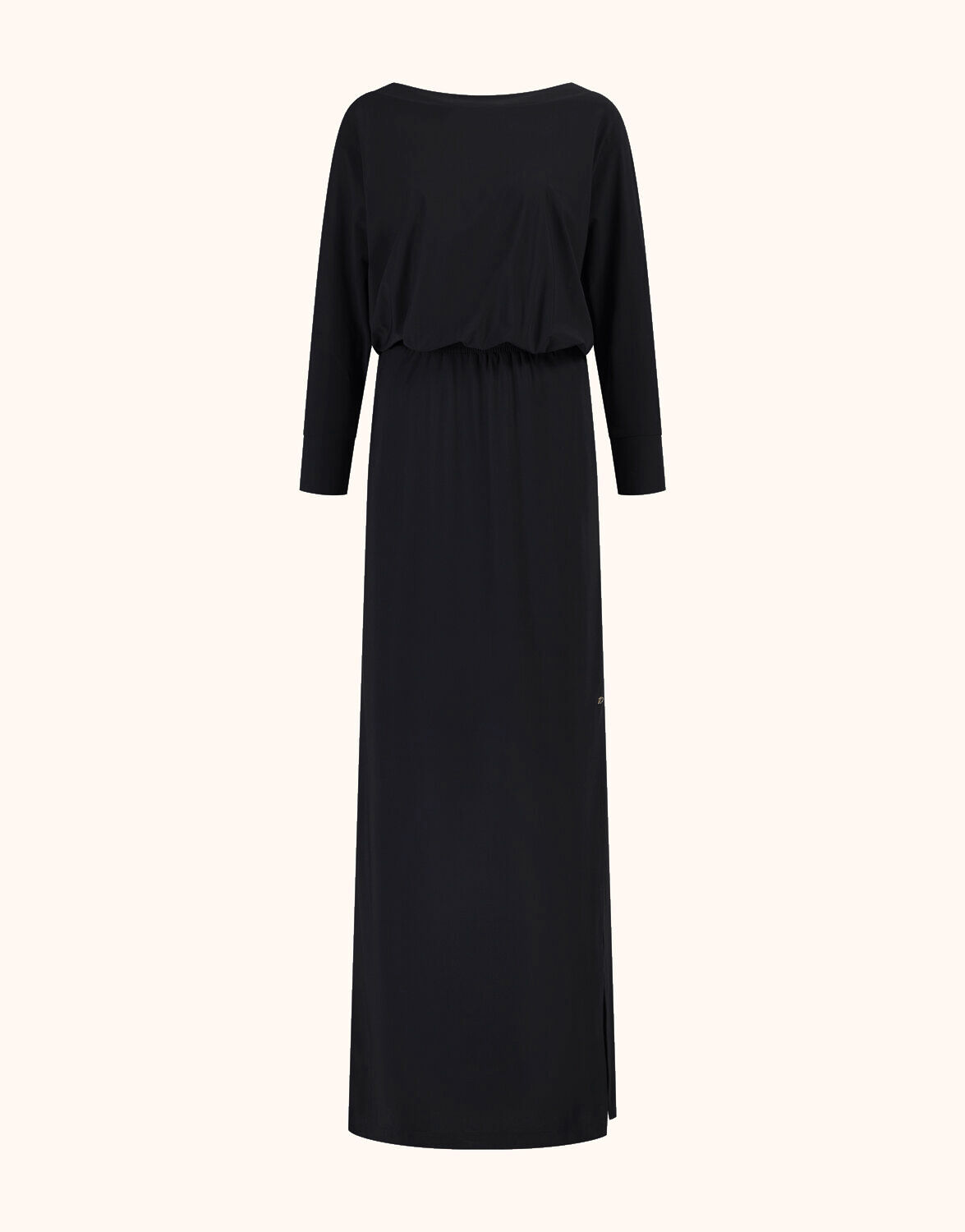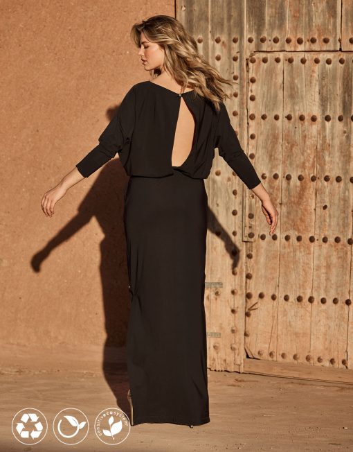 Meet Hillary! She is made from our iconic Italian travel jersey fabric. All our travel jersey styles are made from recycled yarn in an eco-friendly production cycle, read more here! She has an elastic waist, three-quarter sleeves, a cheeky high slit and a daring open back which adds a feminine touch! Simone personally road-tested this gem through dinners and events, making sure she’s the real deal. Slip on some high boots, throw on an oversized blazer like Beau, and boom – you’re all set to steal the spotlight.