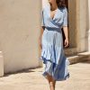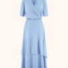 Lea is the perfect dress that frames your silhouette beautifully. She is made from our iconic Italian travel jersey fabric. All our travel jersey styles are made from recycled yarn in an eco-friendly production cycle, read more here! Lea has an overlay V-neckline and layered skirt. She comes with a snap button, which you can attach on your preferred spot on the neckline. Combine Lea with our slip dress Mythical dress and dress her easily up and down. Wear her to dinner with heels or with slippers on a warm summer day.
