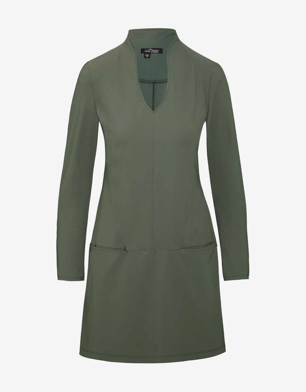 Stella is the ultimate tunic dress for keeping comfortable while remaining chic. She is made from our iconic Italian travel jersey fabric. All our travel jersey styles are made from recycled yarn in an eco-friendly production cycle, read more here! Stella has a sexy shaped neckline with a little collar, long sleeves and a flattering slightly tailored cut. Wear Stella with matching leggings Lima and/or a blazer. You can wear her to work or on your day off, she is perfect for every occasion!