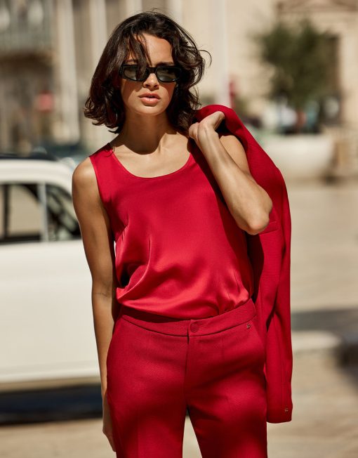 Zelda is a simple yet stylish sleeveless top crafted from flowy satin. She has a round neckline and a longer back to create a comfortable fit. Wear her underneath your blazer or with one of our skirts on a sunny day. Note: this delicate fabric requires careful handling, avoid contact with rough or sharp objects to prevent damage.